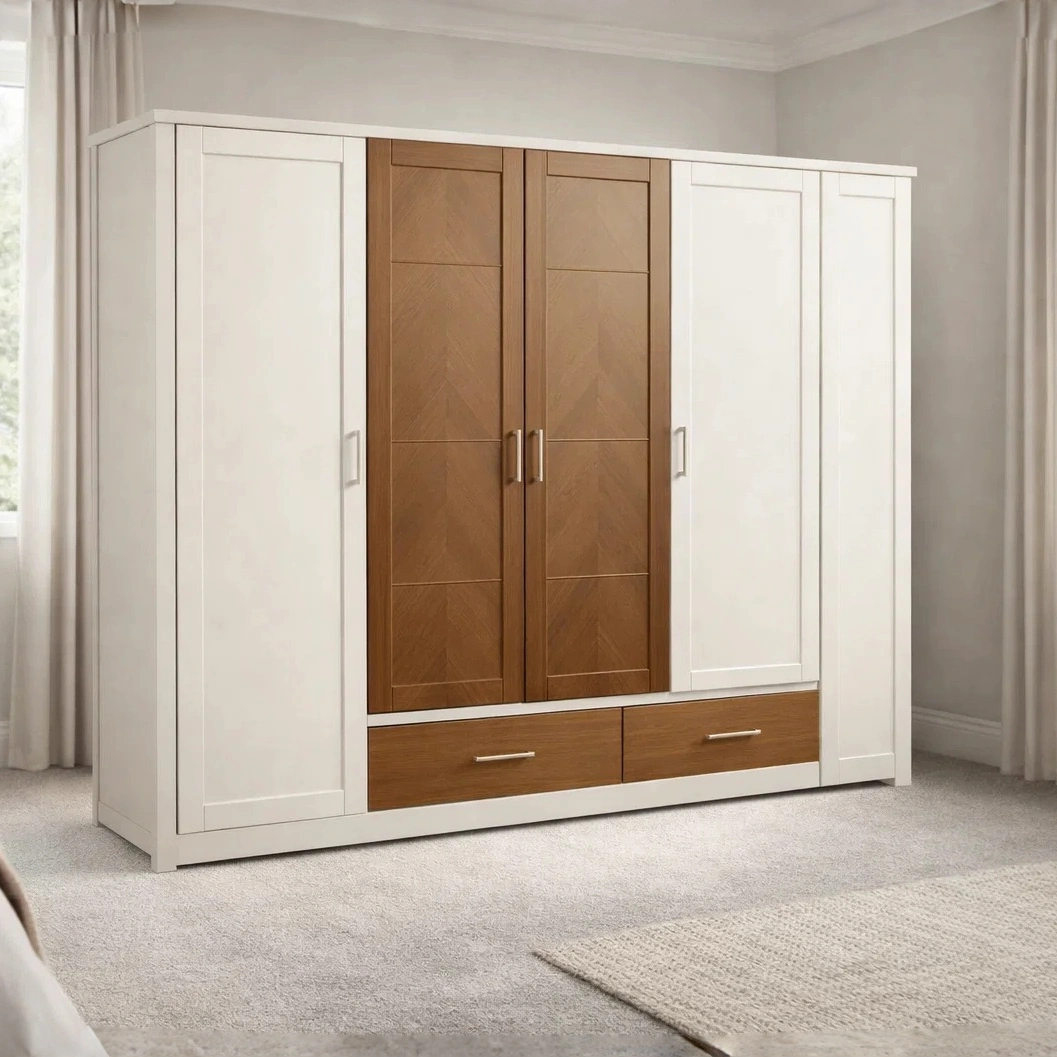 Geräumiger Kleiderschrank in Eiche-Optik, Weiß und Braun für strukturierte Aufbewahrung.
